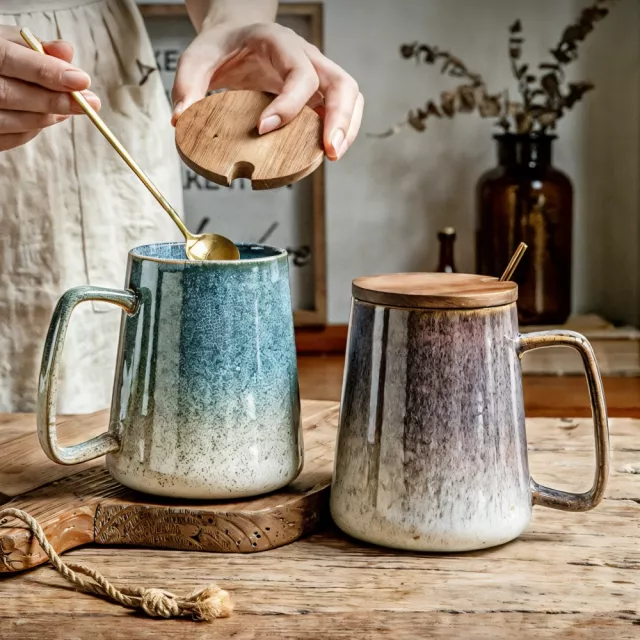 Large Retro Ceramic Mug with Lid & Spoon – 26 oz Tea & Coffee Cup